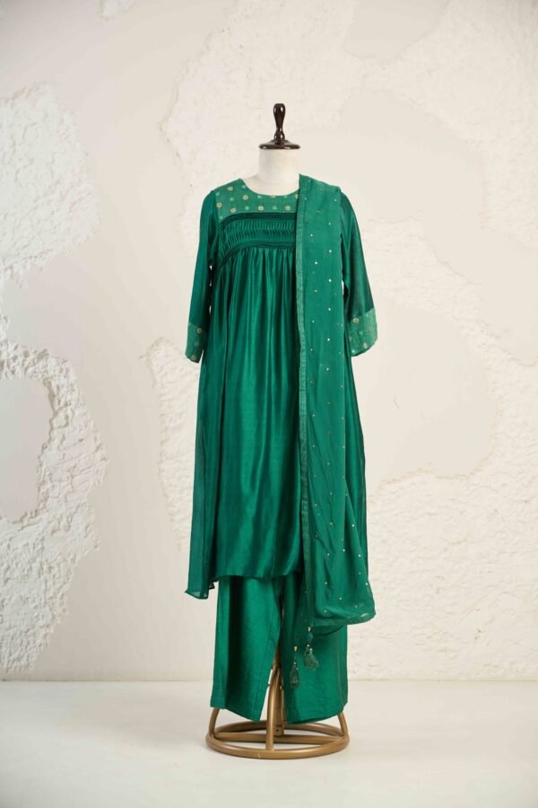 Perfect for festive gatherings or refined celebrations, Emerald Embellished Yoke Kurta Set is made from chanderi featuring a delicately embellished yoke and pin tuck detailing. It comes with matching palazzos and embellished organza dupatta.