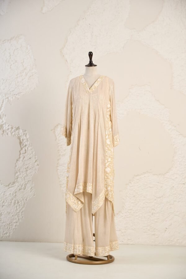 Satin Silk Asymmetrical Kurta with embroidered gara details and matching palazzos