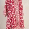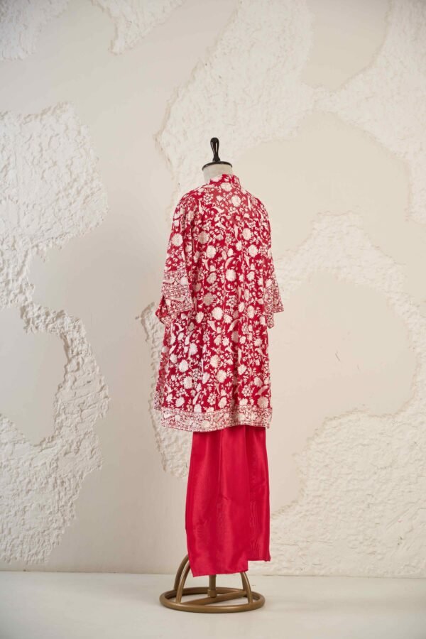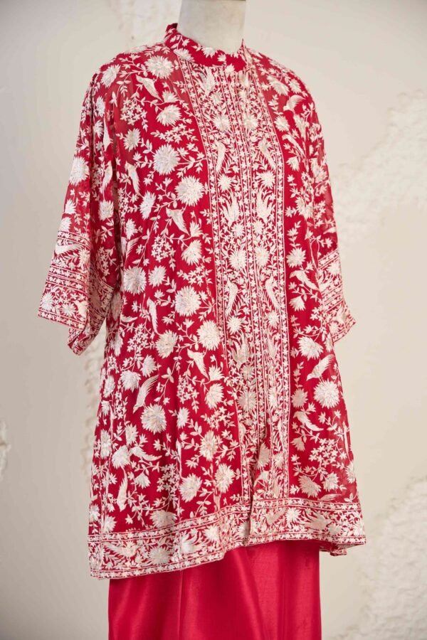 This vibrant co-ord set features a striking gara embroidered short kurta paired with cotton silk afghan pants, creating a statement look perfect for celebrations or gatherings.